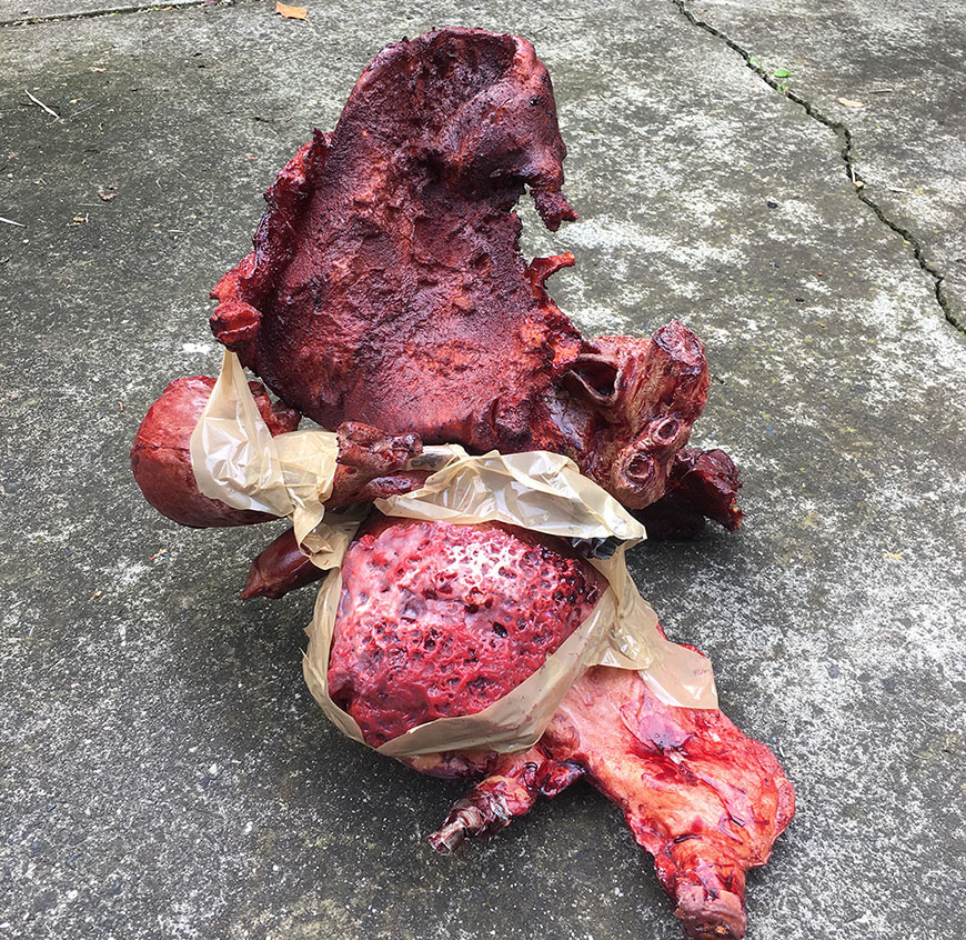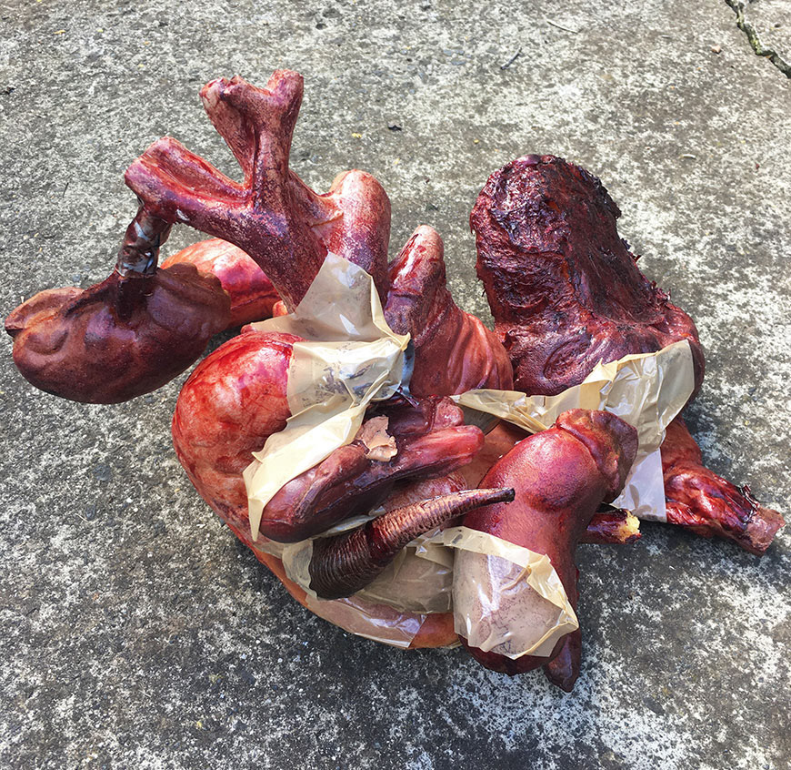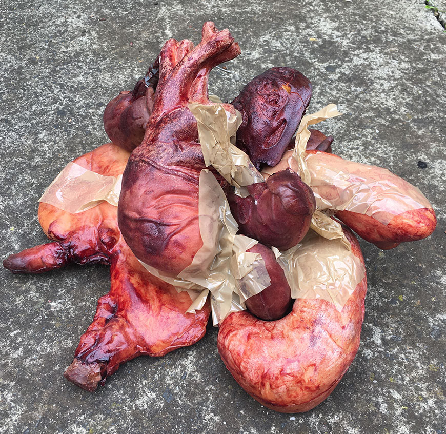 Internal human organs connected together with packing tape, a simulation of the precarious nature of the human body. The body as a kind of failure waiting to happen
